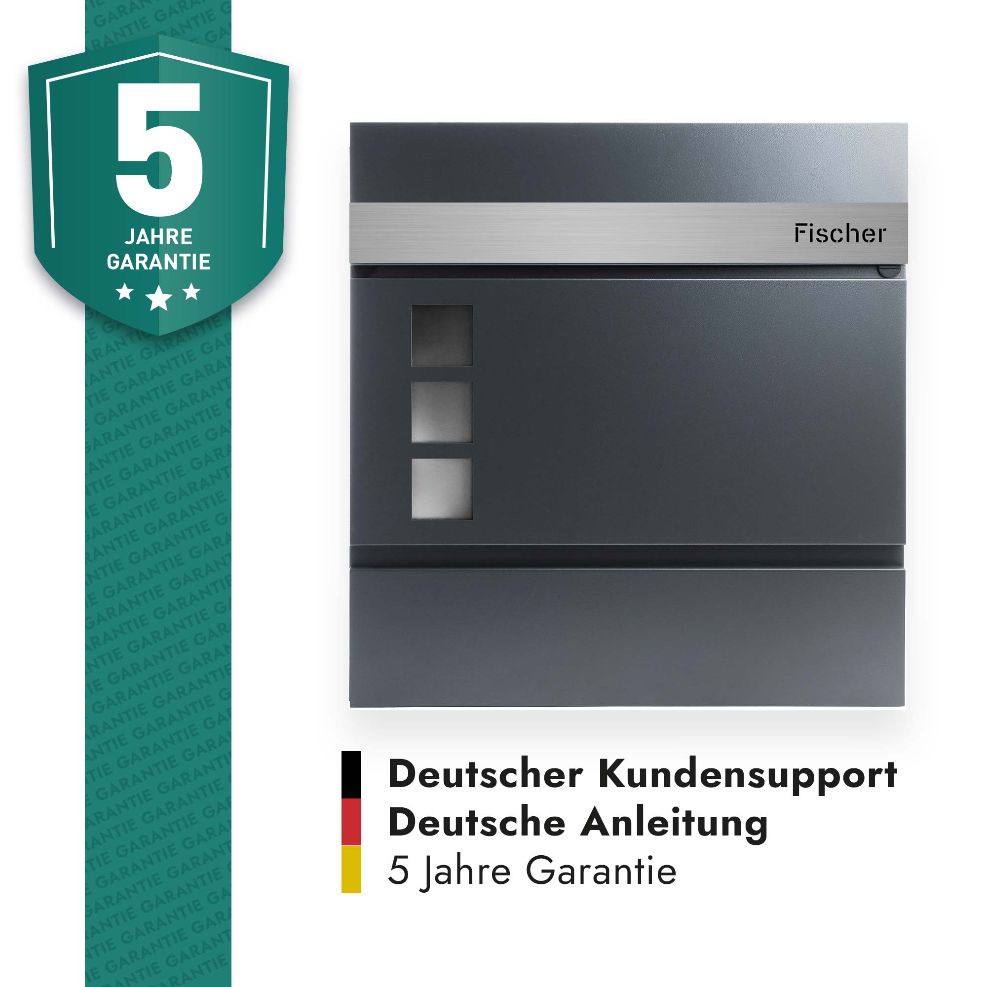 Briefkasten Helsingborg Anthrazit (RAL7016) Zinkstahl mit Zeitungsfach und Sichtfenster - personalisiert mit Namensschild als Gravur