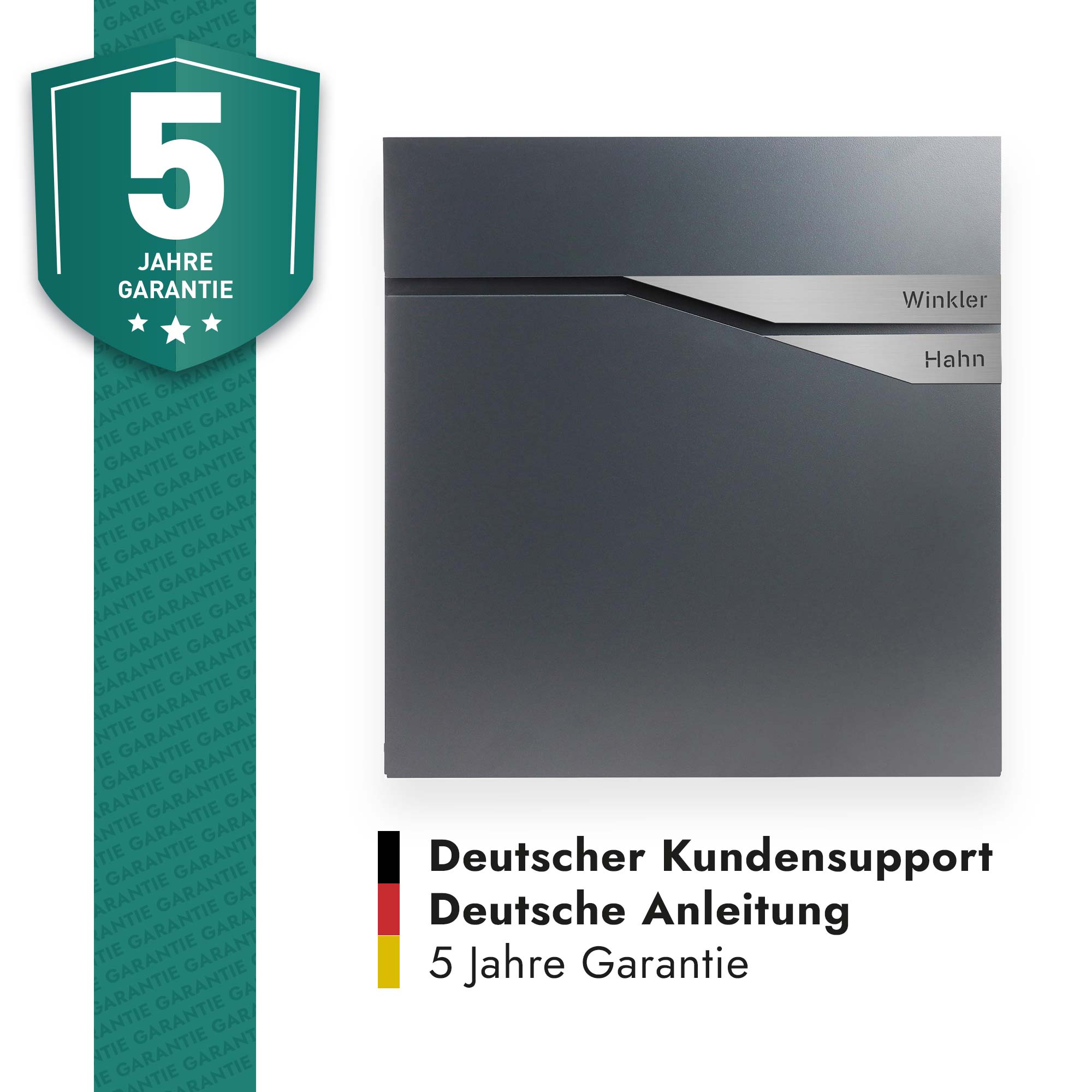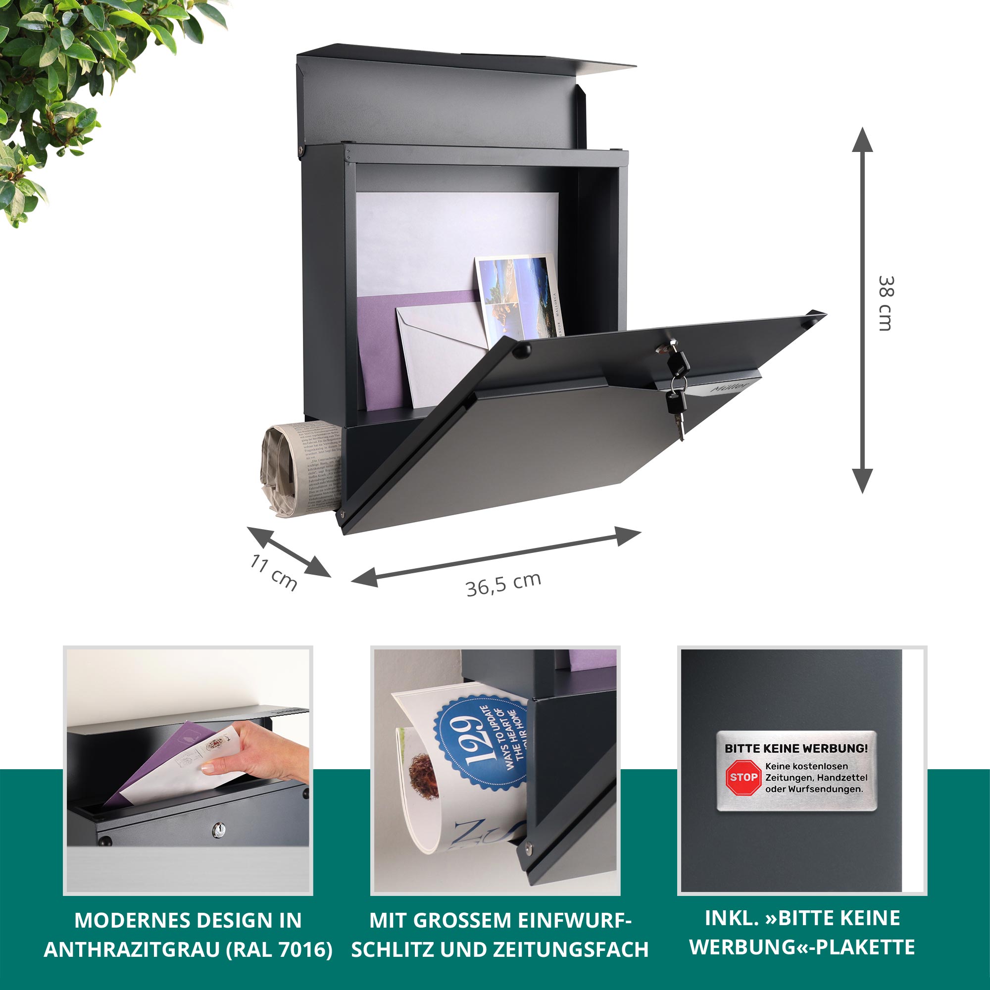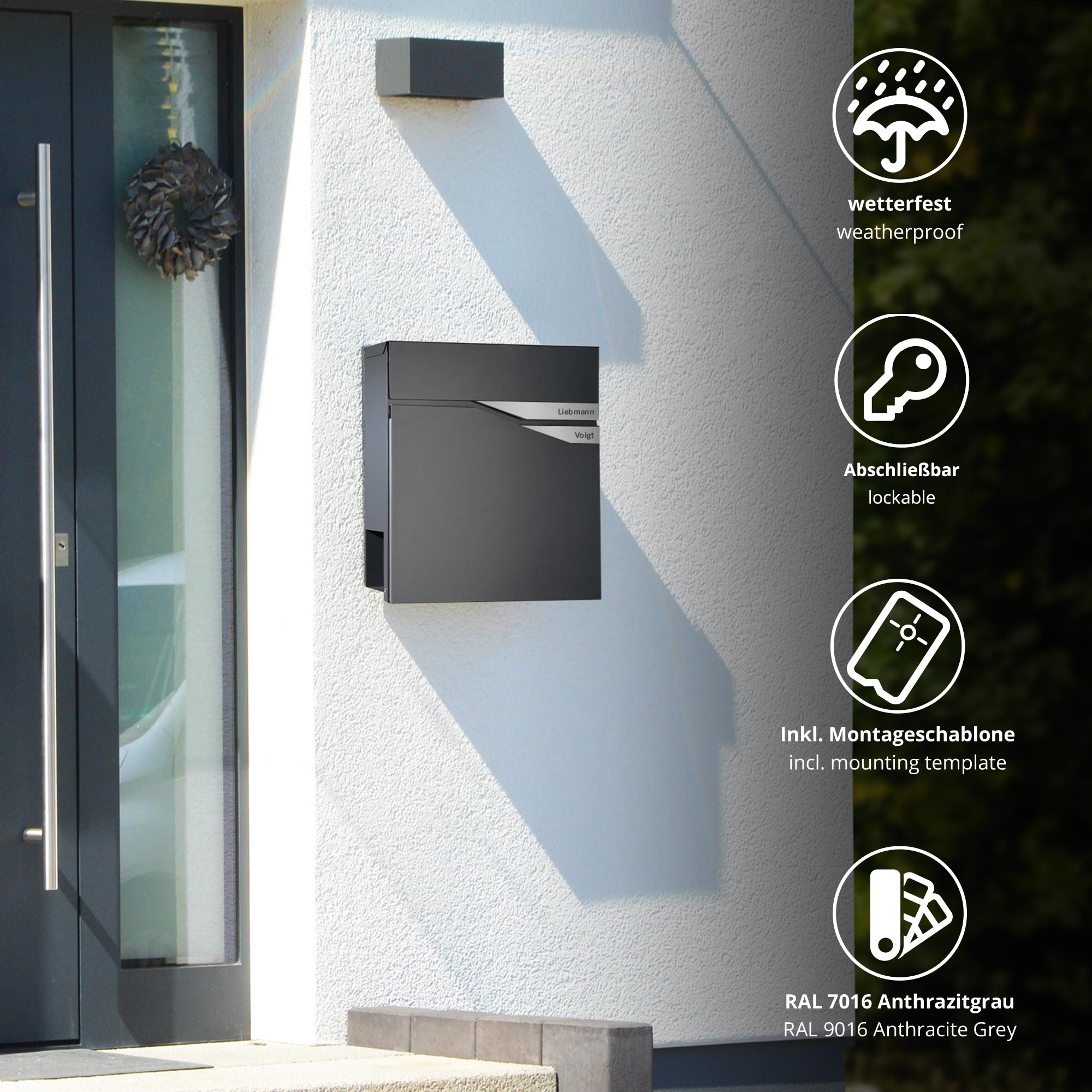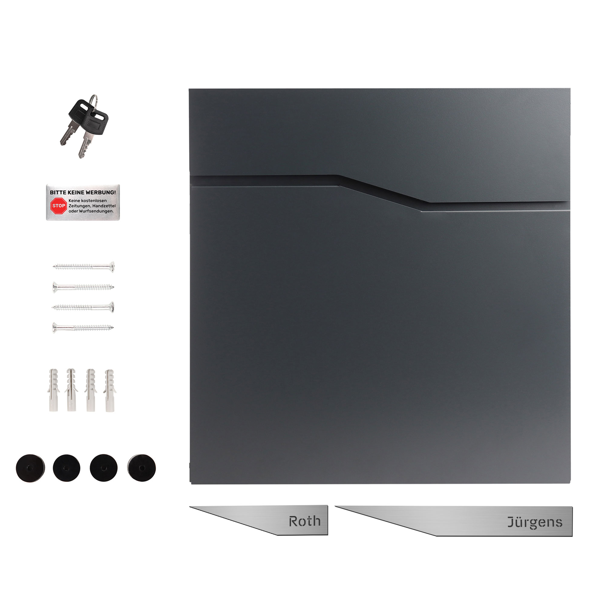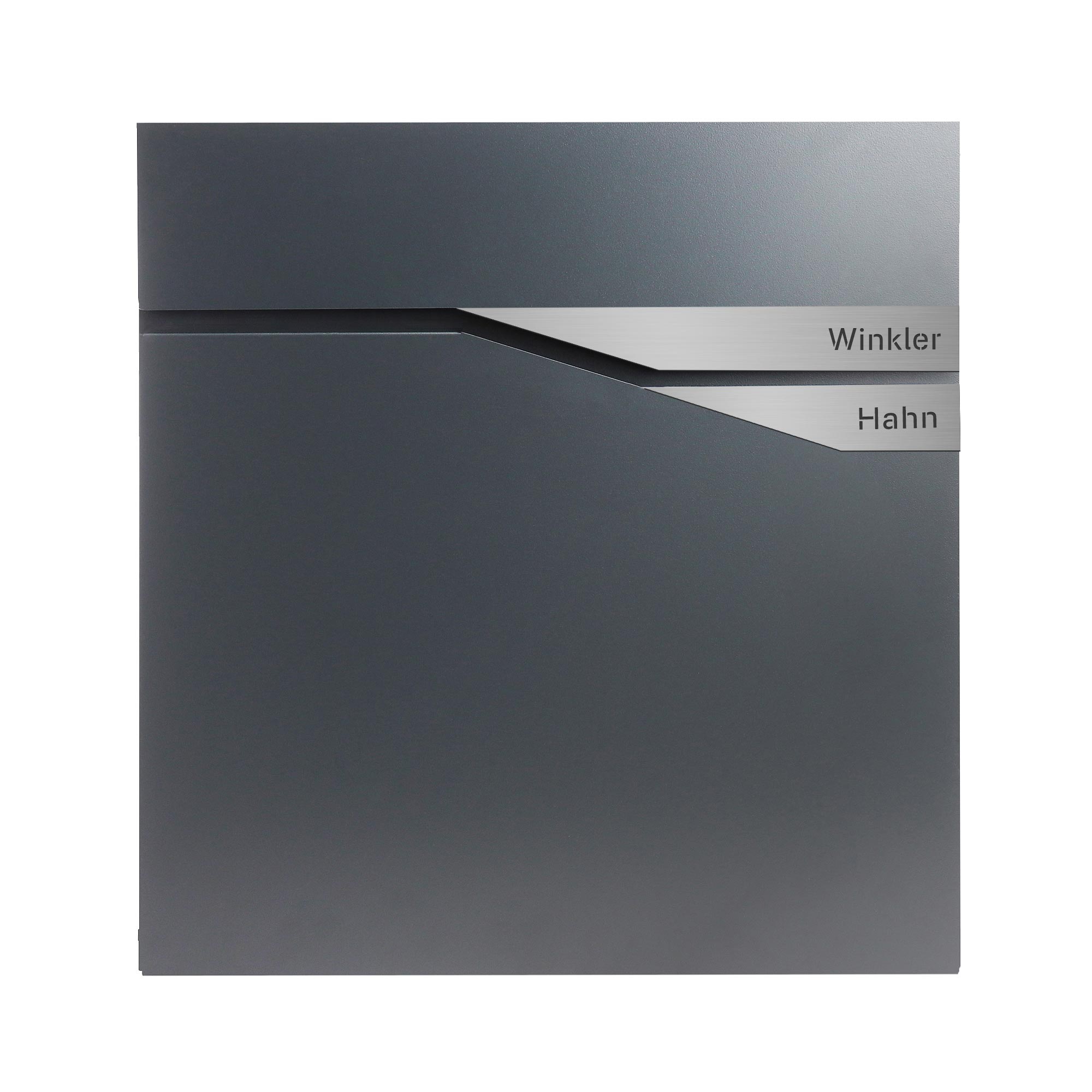 Briefkasten Trelleborg Anthrazit (RAL7016) Zinkstahl mit Zeitungsfach - personalisiert mit 2 Namensschildern als Gravur
