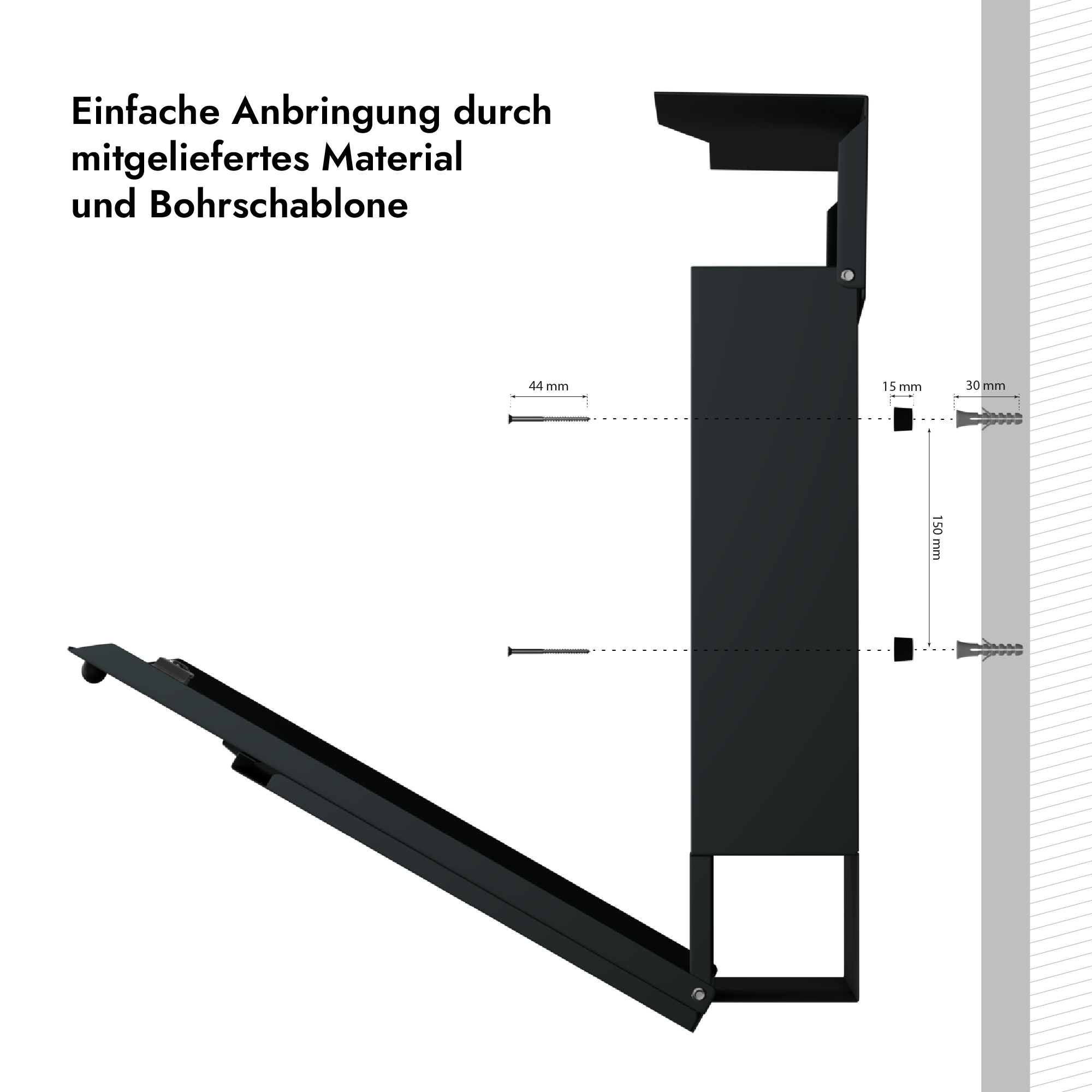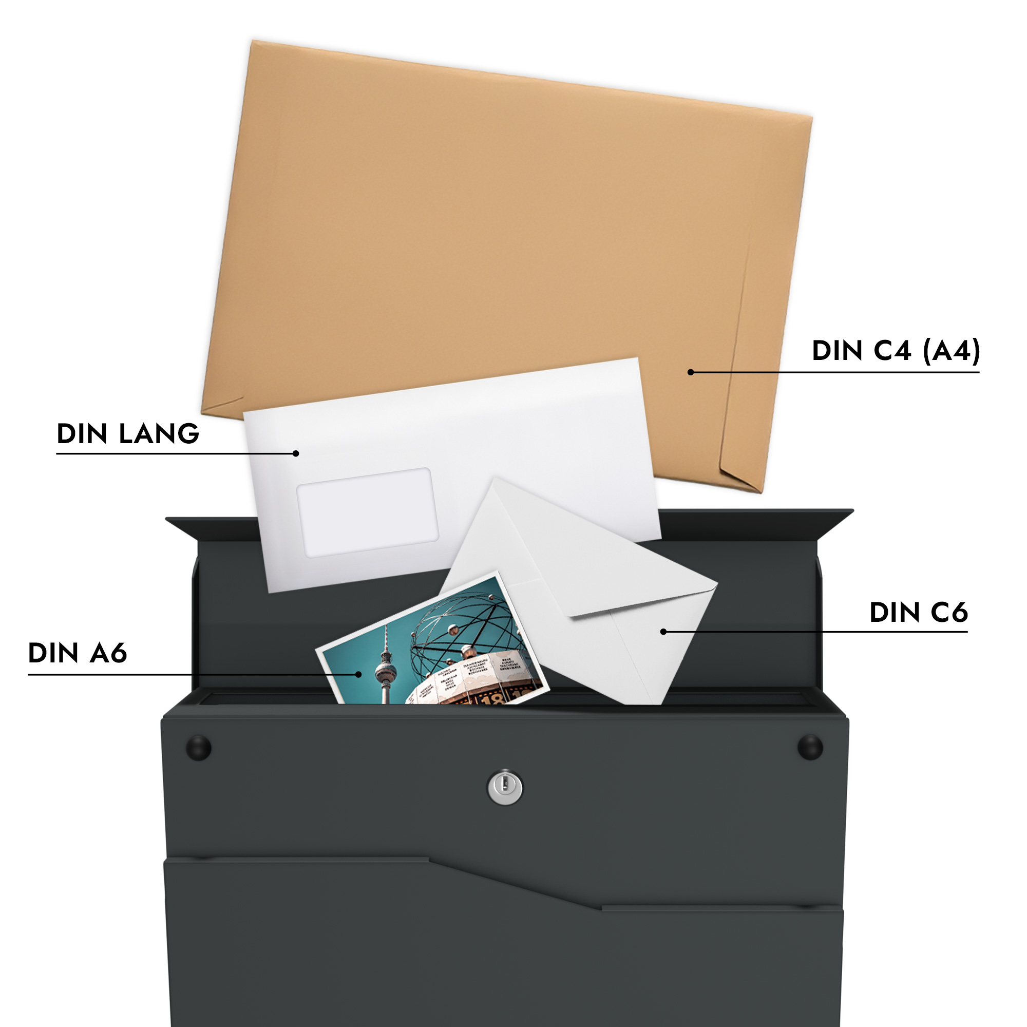 - Praktisches Zeitungsfach (Zeitungsrolle) – Separater Bereich für Zeitungen und Magazine für trockene und ordentliche Aufbewahrung. Der Wandbriefkasten verfügt zudem über ein robustes Schloss mit zwei Schlüsseln