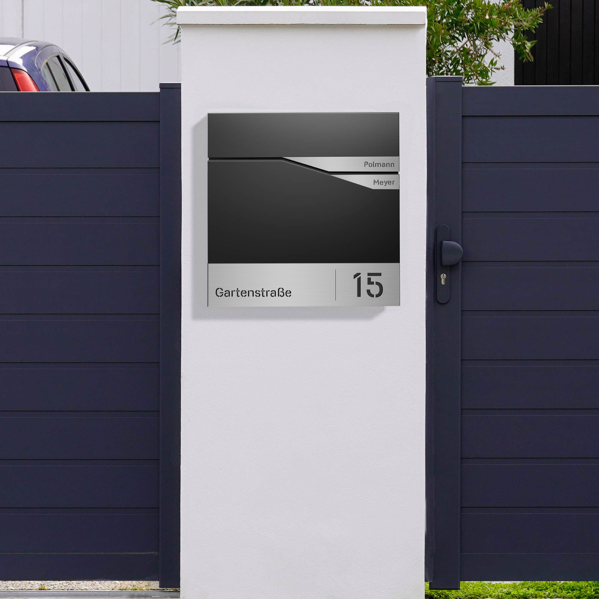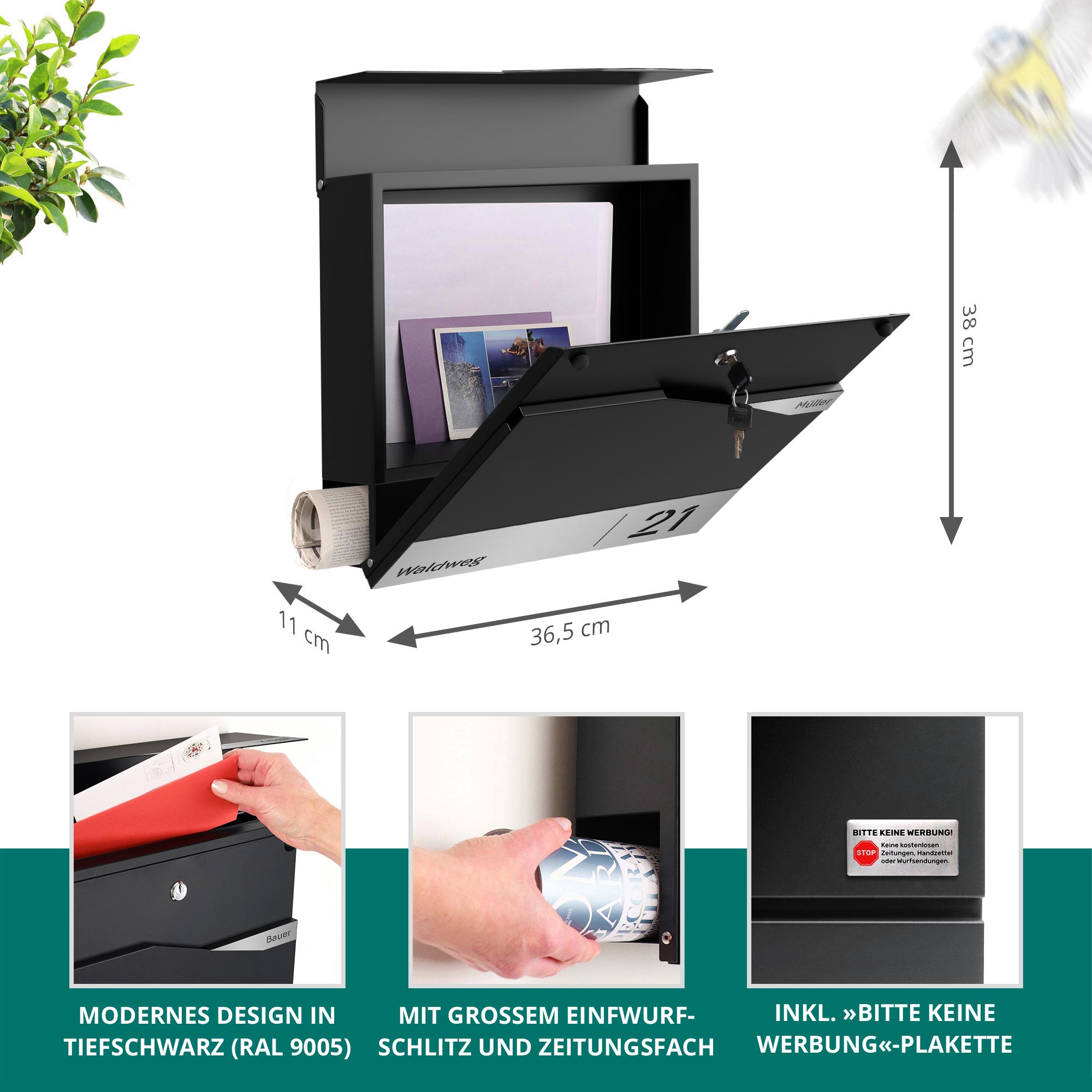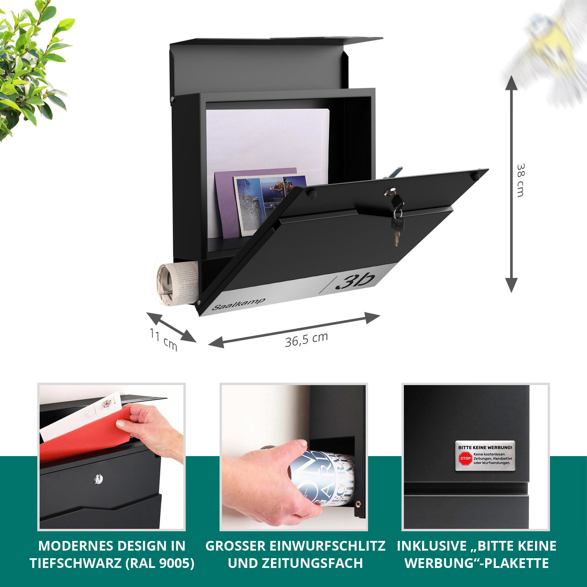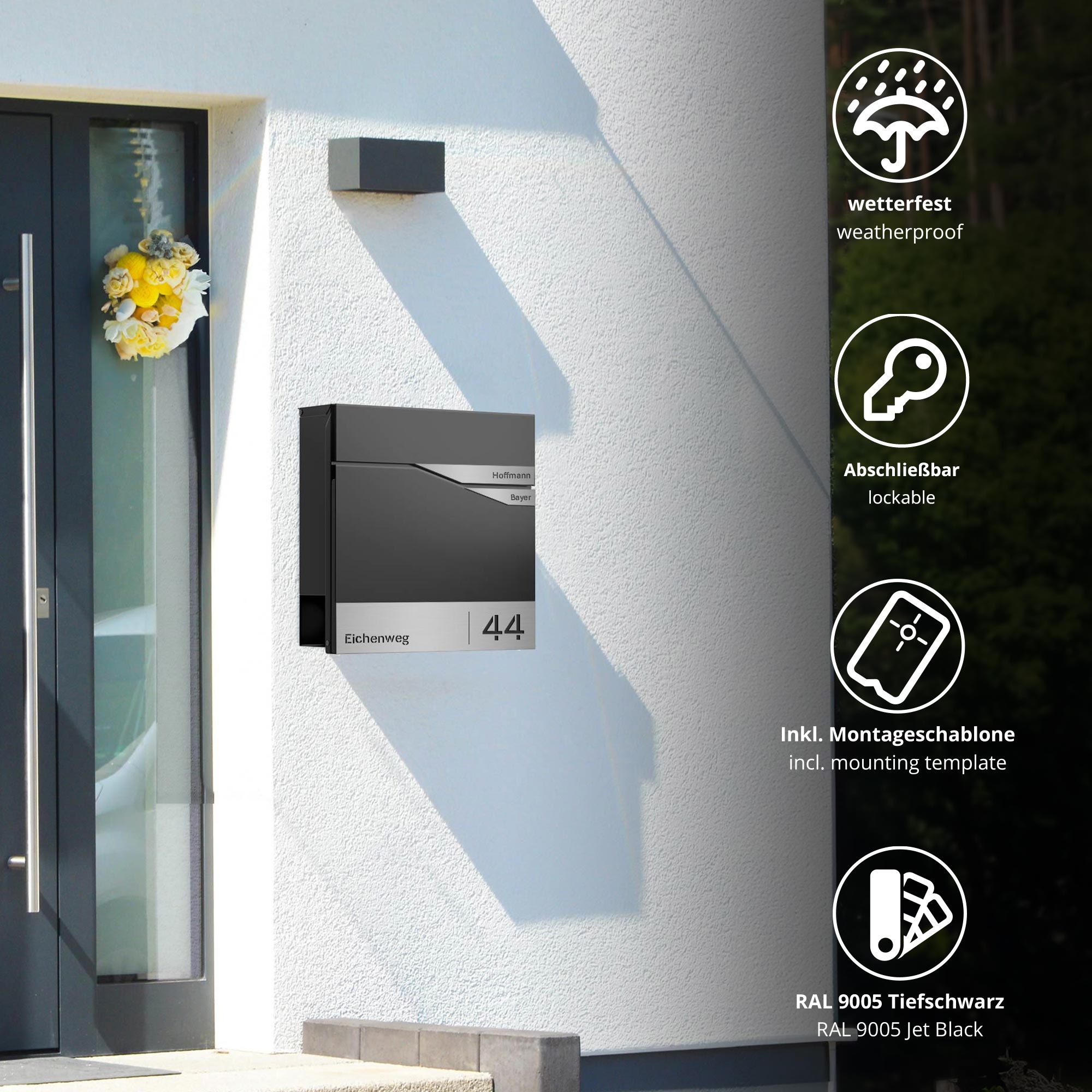 Briefkasten Trelleborg Schwarz (RAL9005) Zinkstahl mit Zeitungsfach - personalisiert mit 2 Namensschildern, Hausnummer und Straßennamen als Gravur
