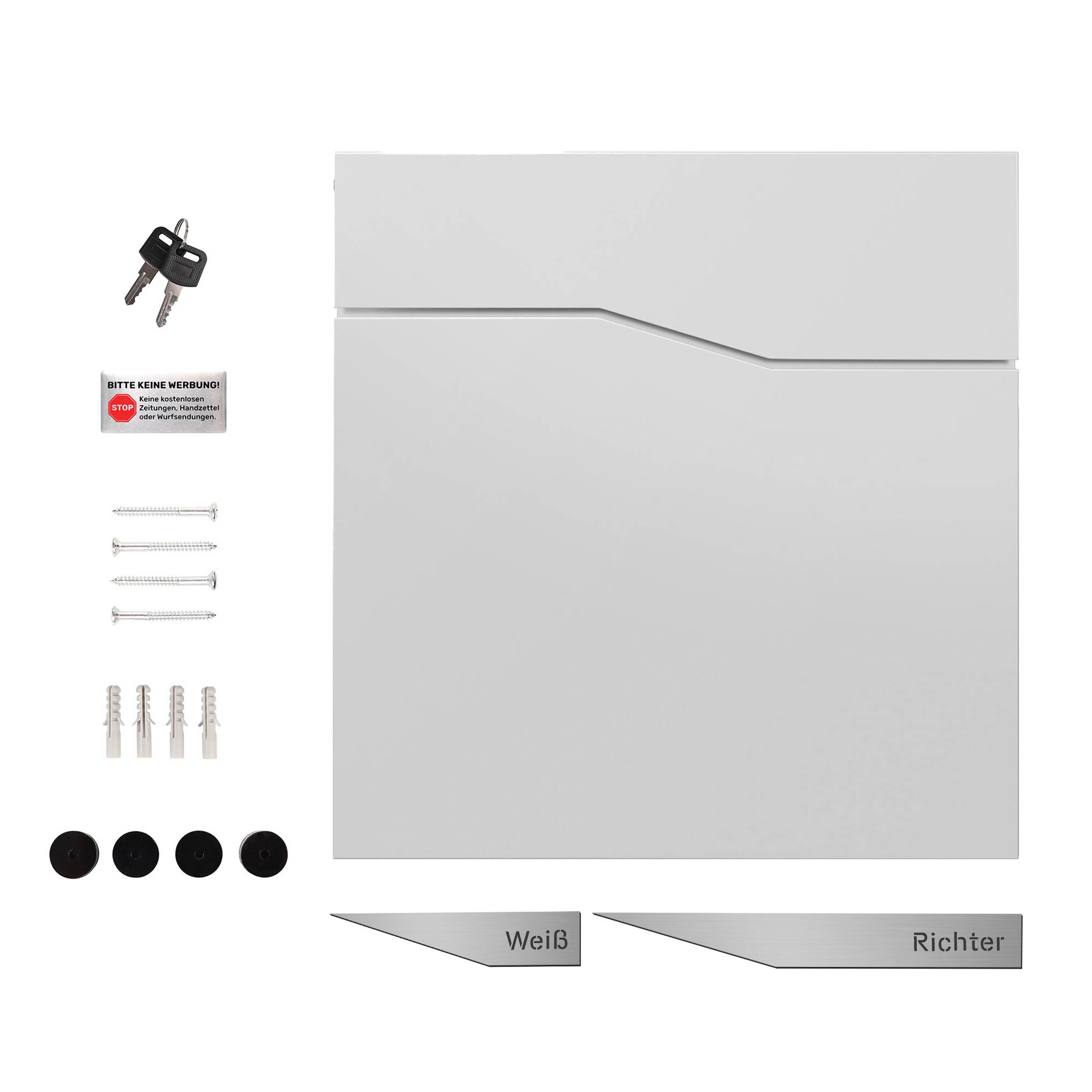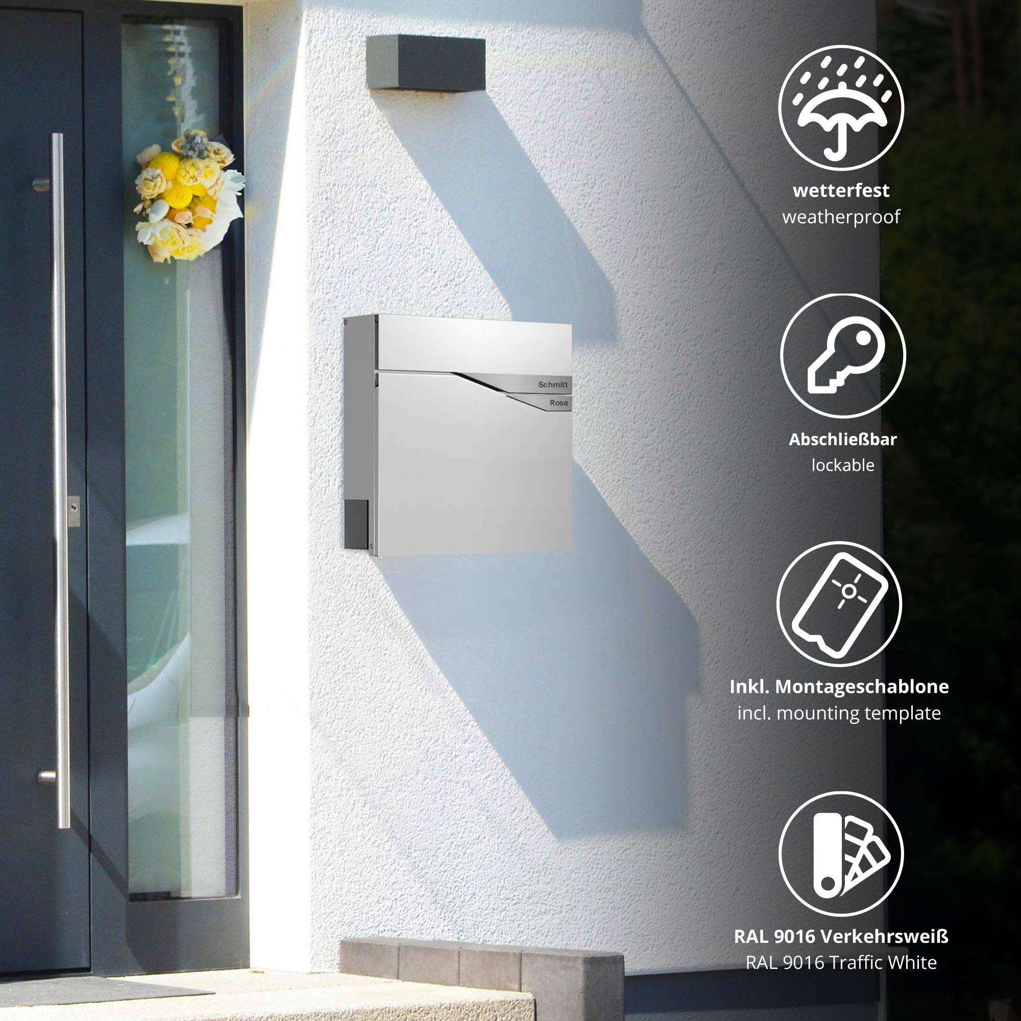 Der Briefkasten Trelleborg in elegantem Weiß (RAL9016) vereint klare Formgebung mit funktionalem Design und persönlicher Note. Zwei silberfarbene Plaketten auf der Front des Postkastens lassen sich individuell mit Ihren Wunschnamen gravieren – ideal für Paare oder Wohngemeinschaften. Der Wandbriefkasten besteht aus pulverbeschichtetem Zinkstahl und ist dadurch wetterfest, rostfrei und langlebig. Mit seinem schlichten, skandinavisch inspirierten Design fügt sich die weiße Postbox stilvoll in jedes Eingangsbild ein. Ein separates Zeitungsfach sorgt für die trockene und ordentliche Zustellung von Zeitungen. Zur einfachen Montage sind eine Schablone, das passende Befestigungsmaterial und eine »Bitte keine Werbung«-Plakette im Lieferumfang enthalten.