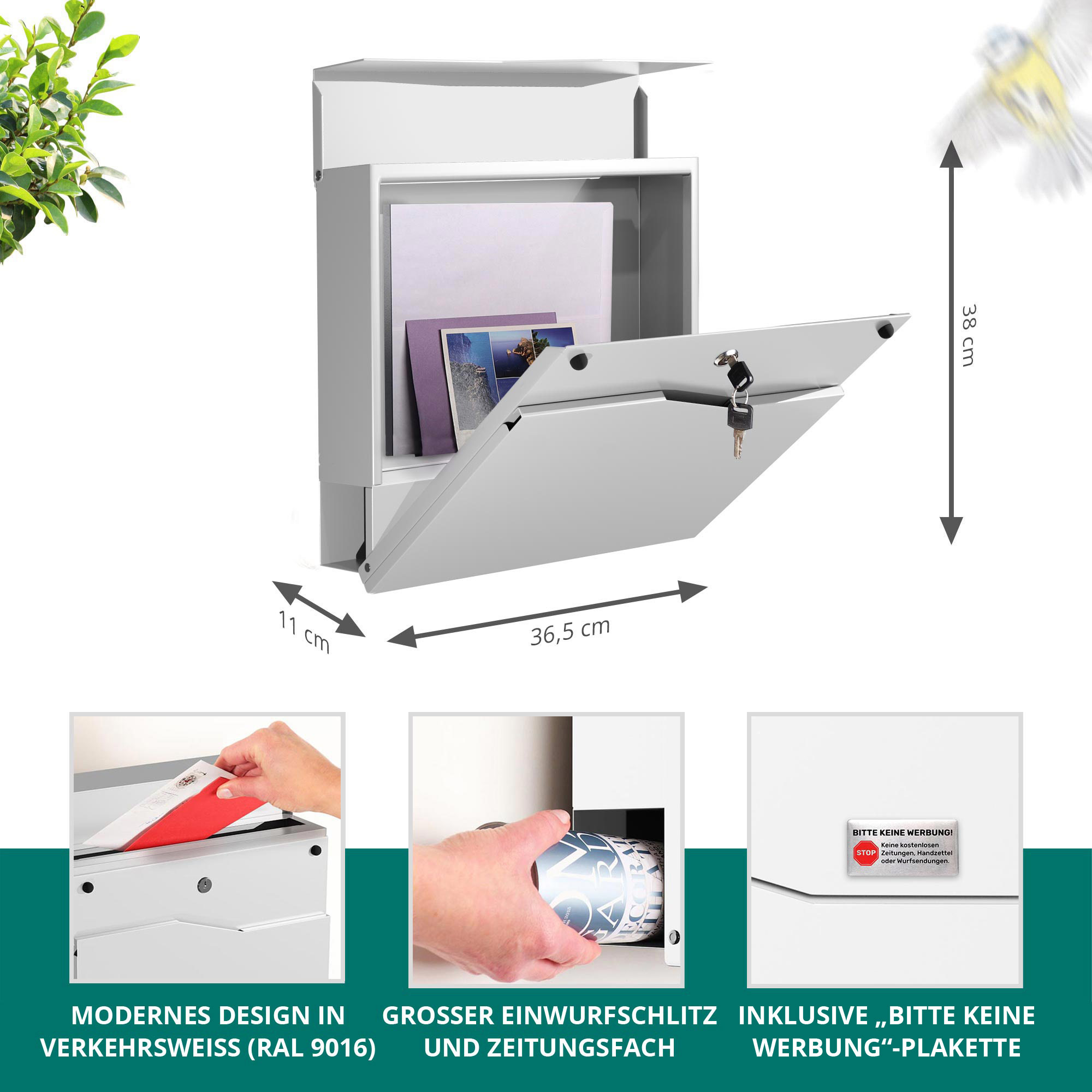 - Zeitungsrolle inklusive – Seitlich angebrachtes Zeitungsfach für eine saubere Trennung von Briefpost und Tageszeitung