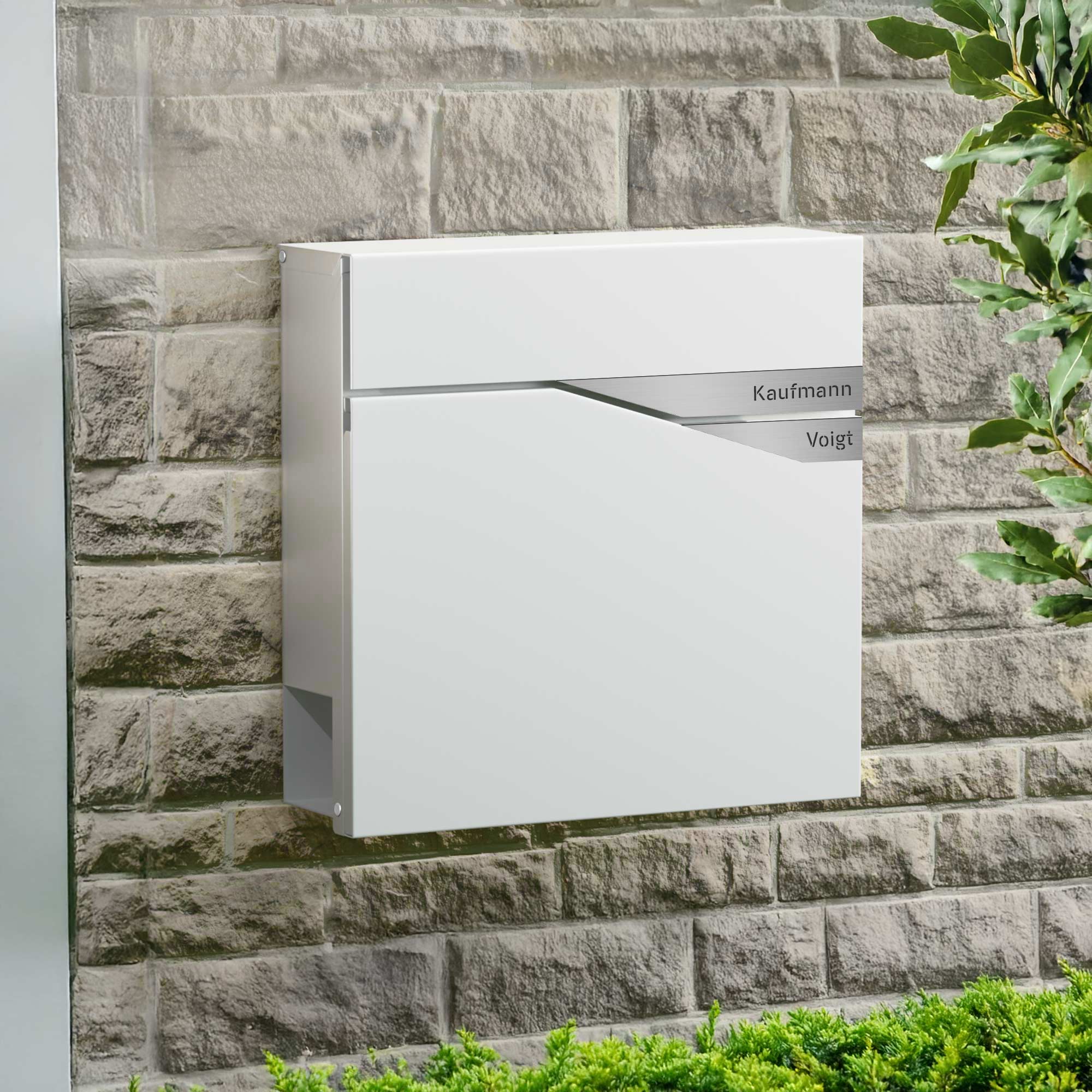 Briefkasten Trelleborg Weiß (RAL9016) Zinkstahl mit Zeitungsfach - personalisiert mit 2 Namensschildern als Gravur