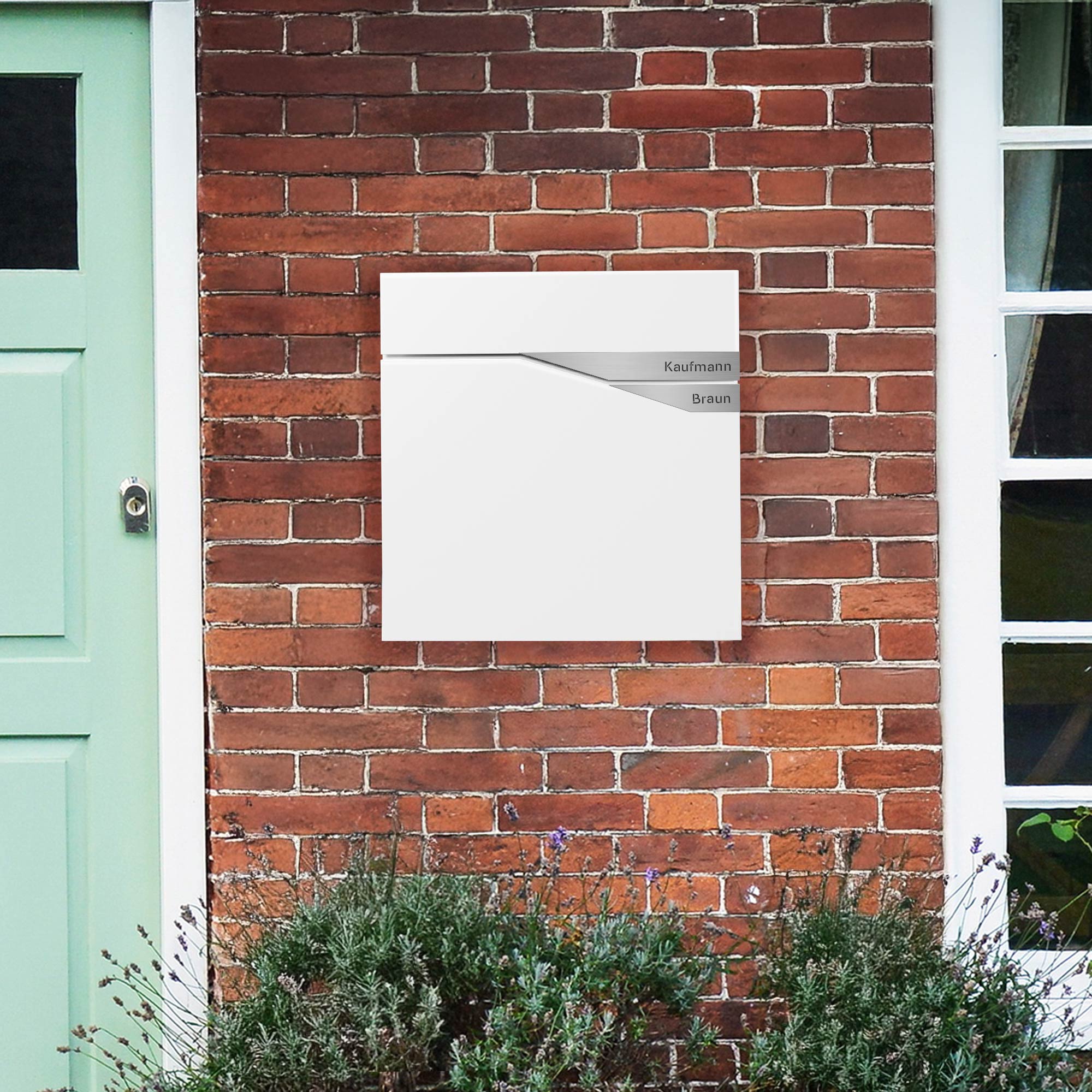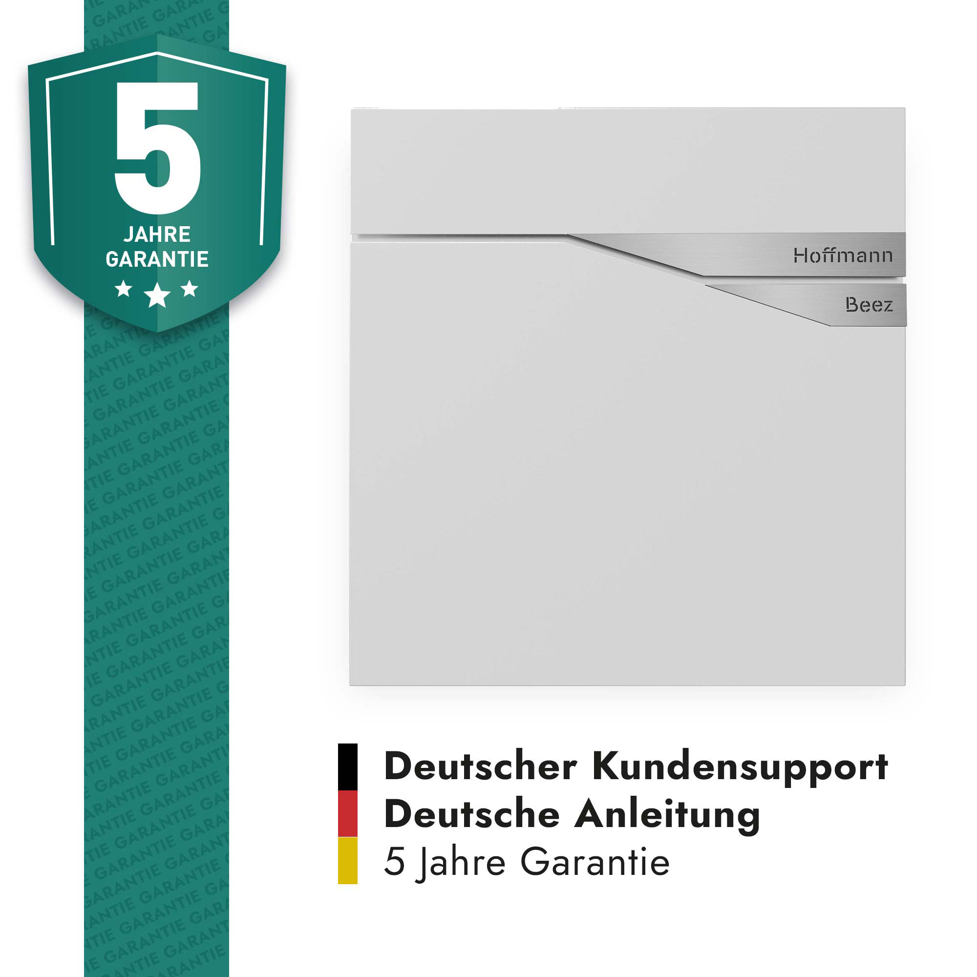 - Personalisierter Namensbriefkasten – Zwei silberfarbene Plaketten, individuell graviert mit Ihren Wunschnamen