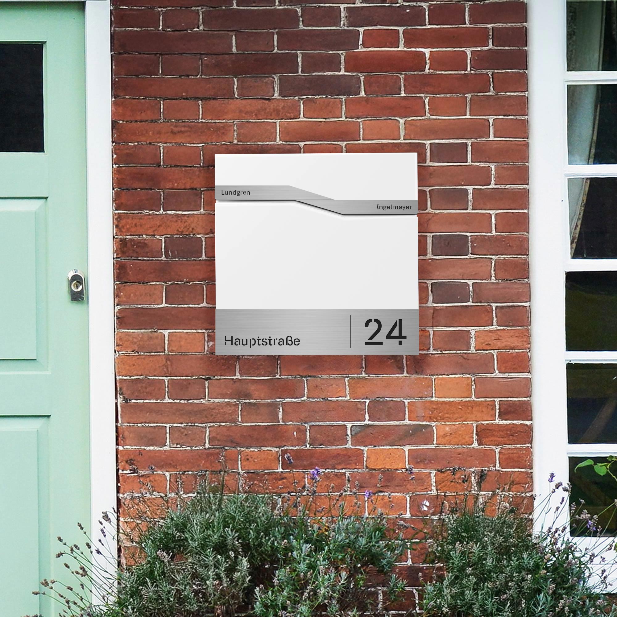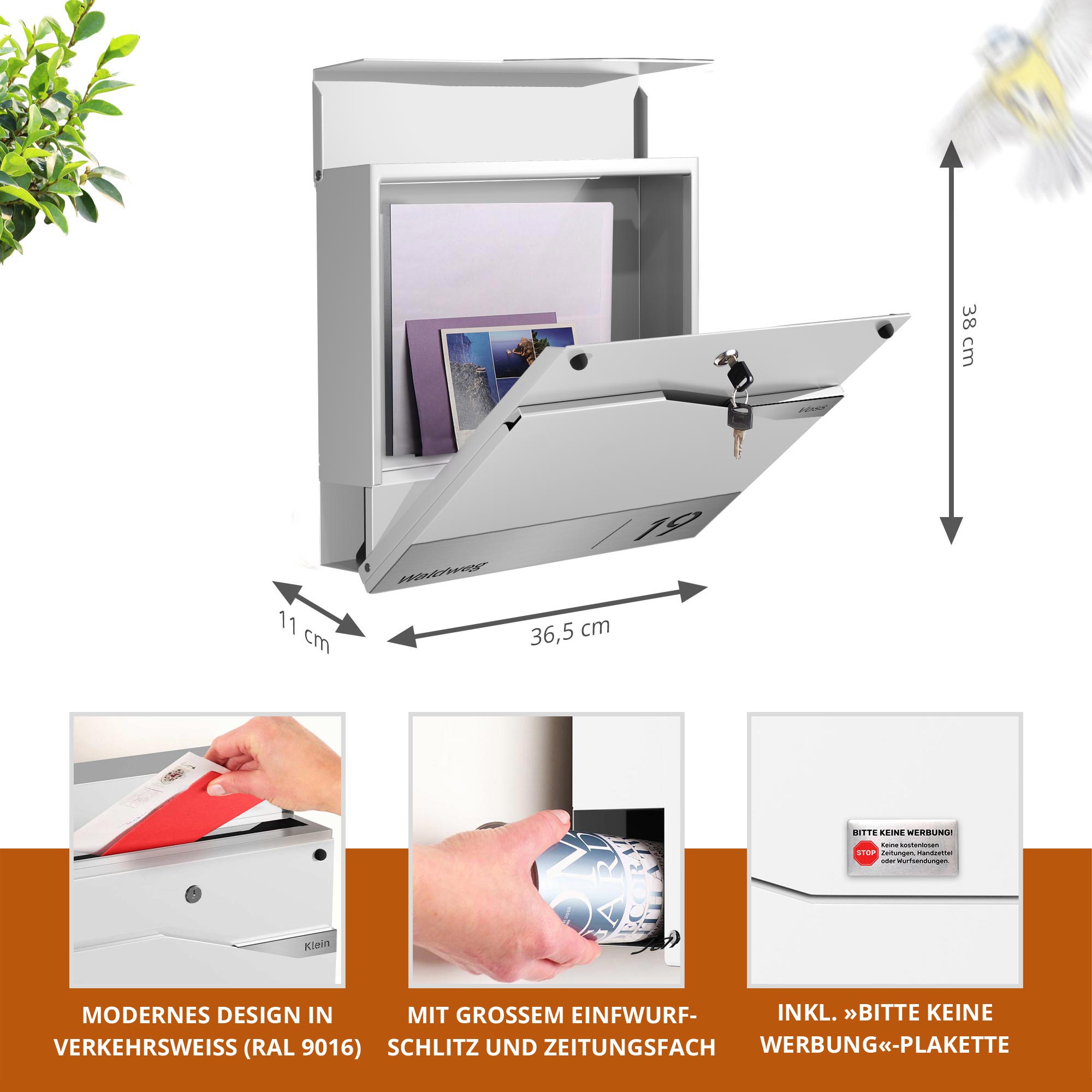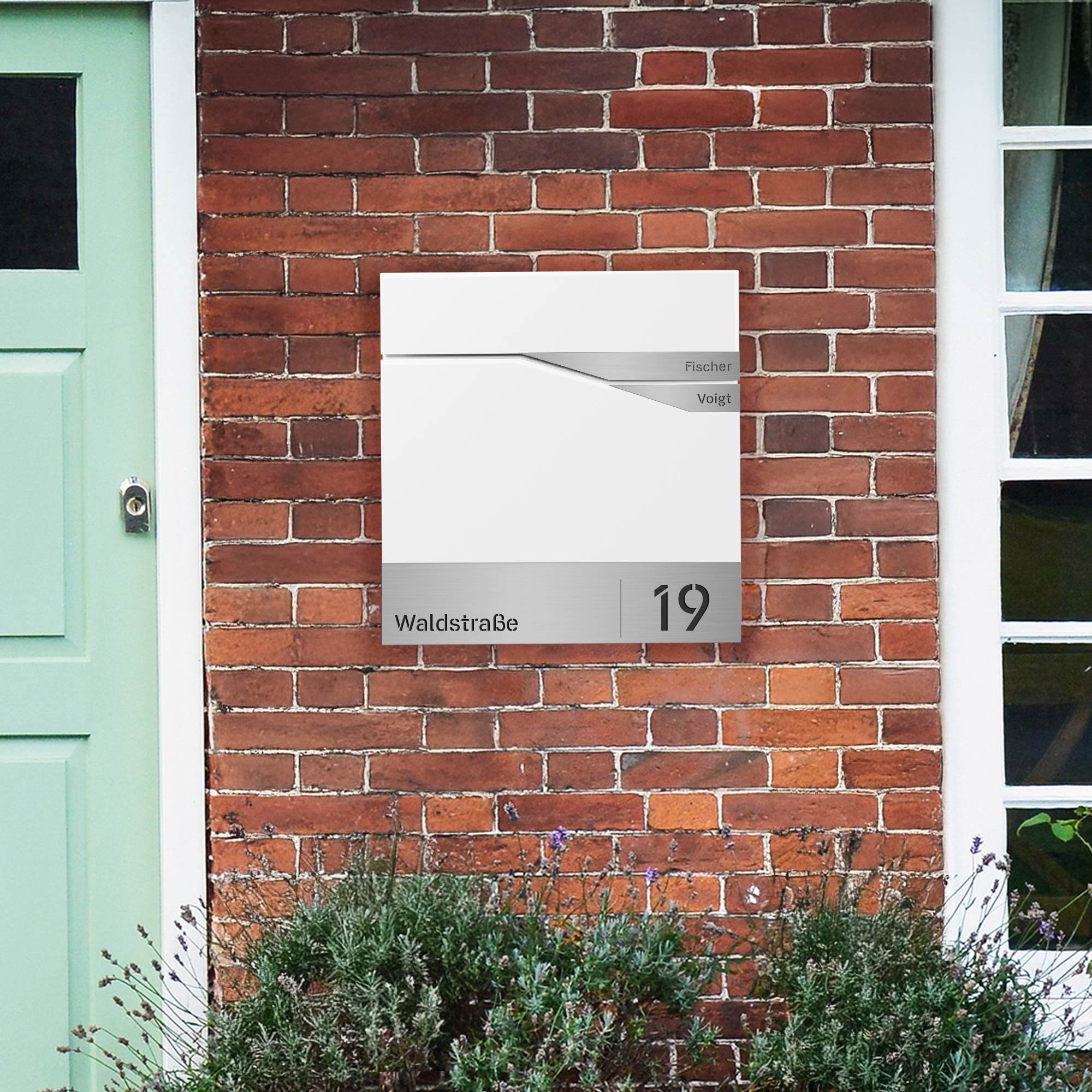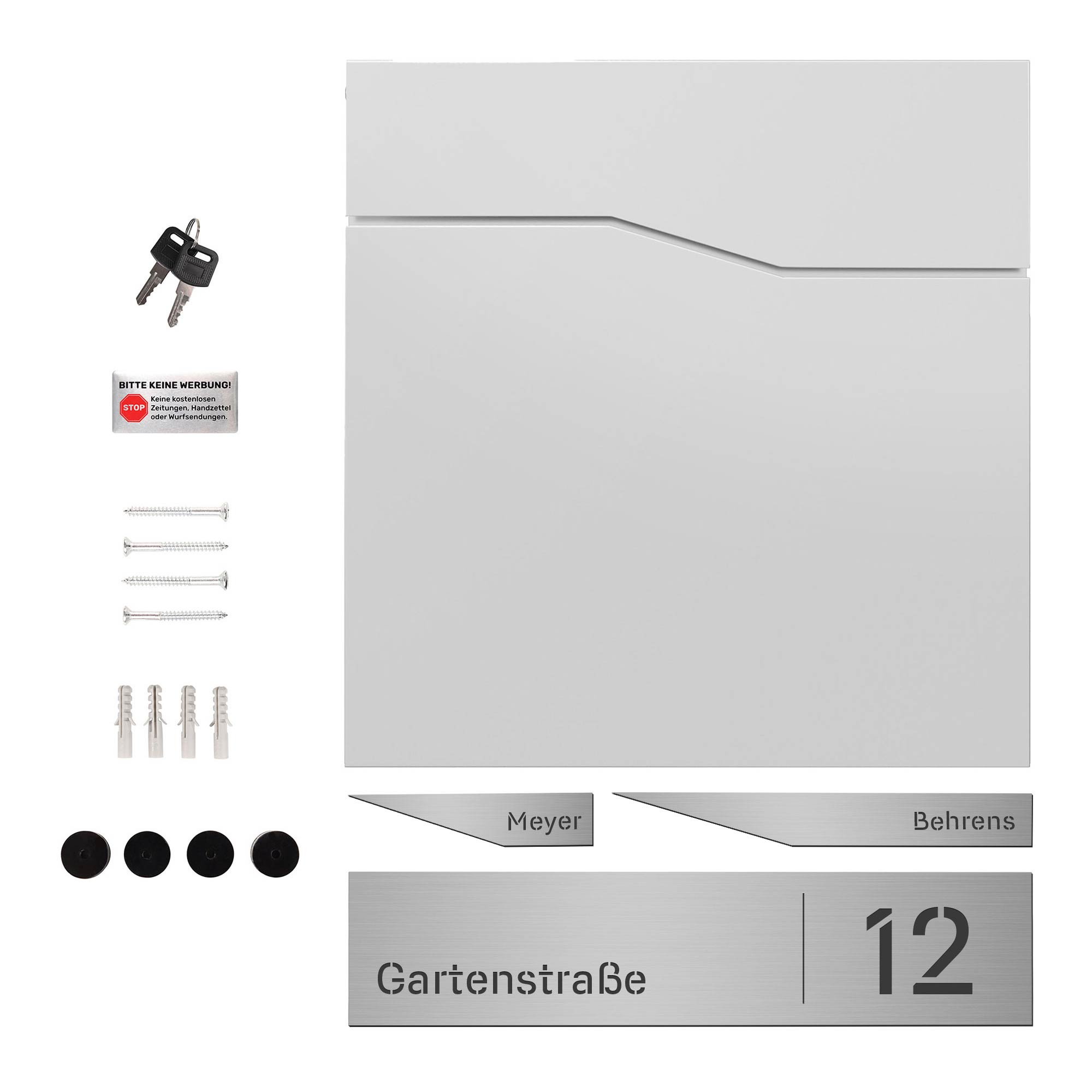 Briefkasten Trelleborg Weiß (RAL9016) Zinkstahl mit Zeitungsfach - personalisiert mit 2 Namensschildern, Hausnummer und Straßennamen als Gravur