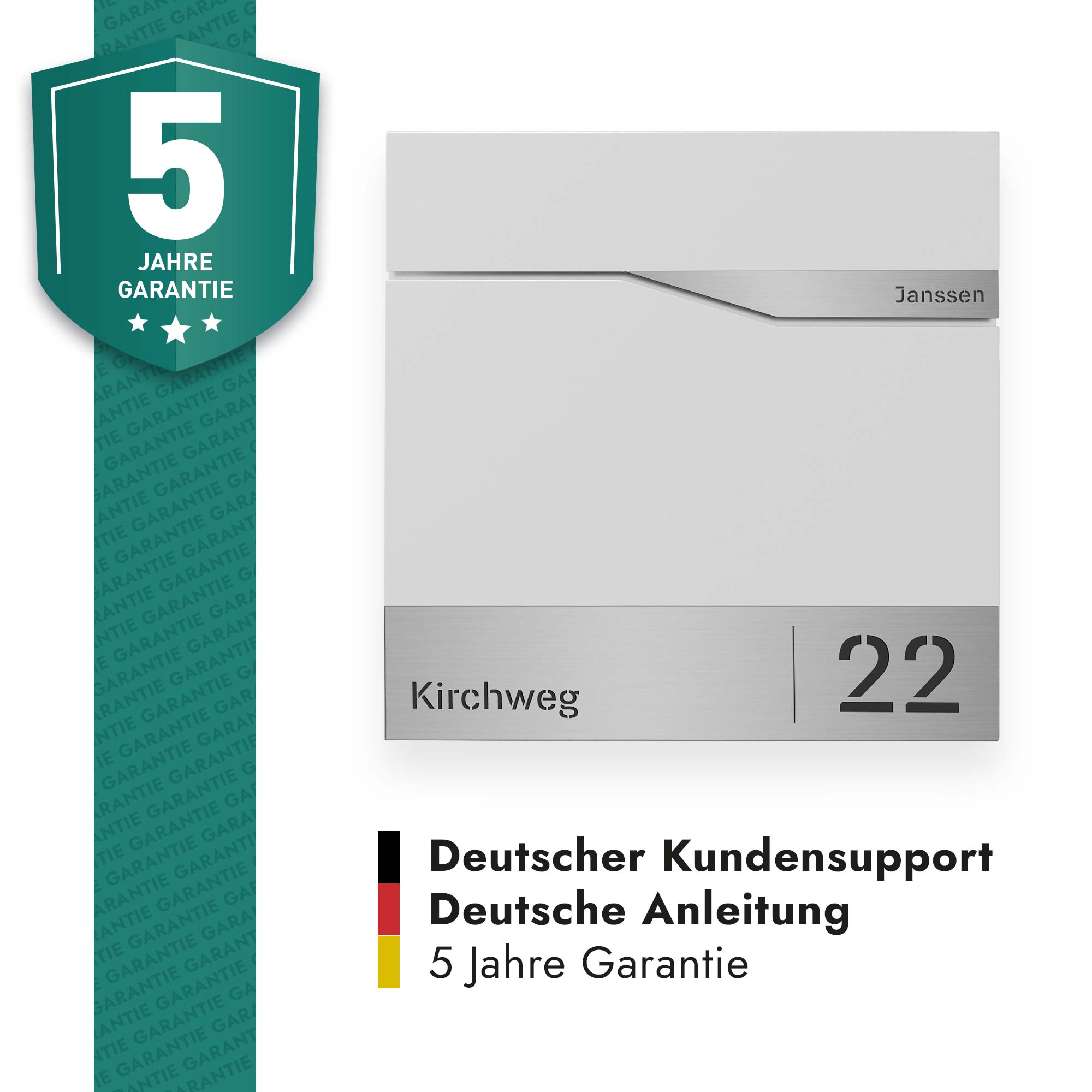 Briefkasten Trelleborg Weiß (RAL9016) Zinkstahl mit Zeitungsfach - personalisiert mit Namensschild, Hausnummer und Straßennamen als Gravur