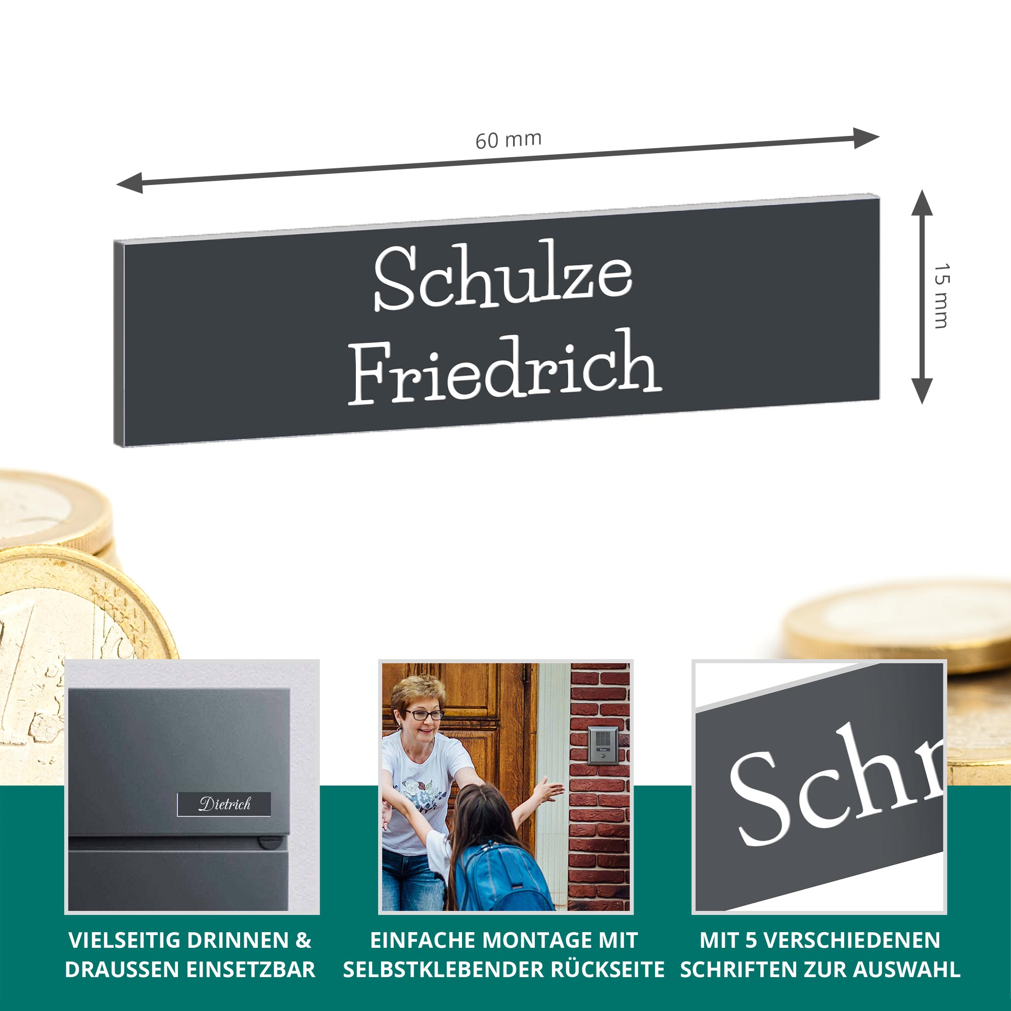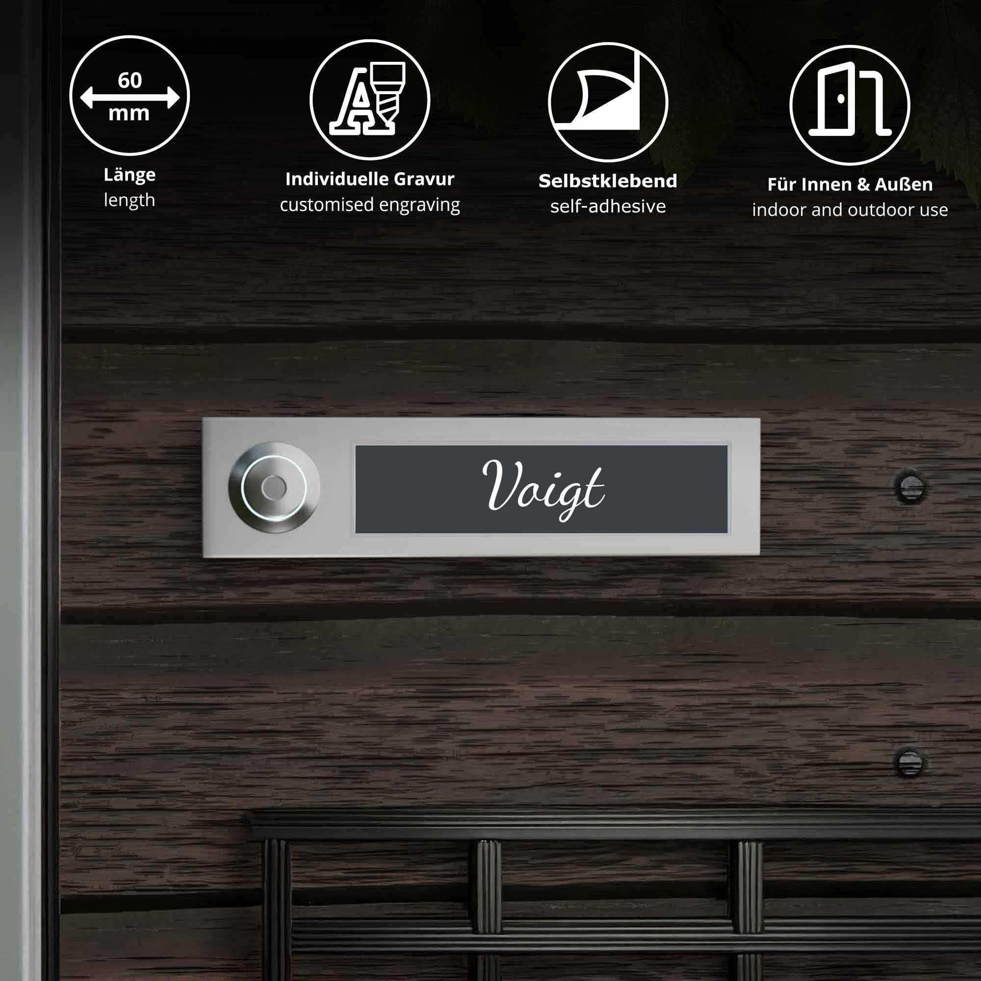 Das Klingelschild Kongsberg in modernem Anthrazit mit weißer Gravur überzeugt durch dezente Eleganz und gute Lesbarkeit. Mit der kompakten Größe von 60 × 15 mm eignet sich das Türschild ideal für Briefkasten oder Haustür. Die individuelle Gravur - in einer oder zwei Zeilen - wird dauerhaft eingearbeitet, und dank selbstklebender Rückseite ist die Montage schnell und einfach. Durch witterungsbeständiges hochwertiges Acryl (2-Schicht-Material) ist das Namensschild sowohl für Innen als auch Außen geeignet. Gestalten Sie Ihr individuelles Briefkastenschild mit Namen oder Hausnummer in fünf Schriftarten, optional mit abgerundeten Ecken oder einem "Keine Werbung"-Schild - unser Namensschild für den Briefkasten ist robust, stilvoll und zeitlos.