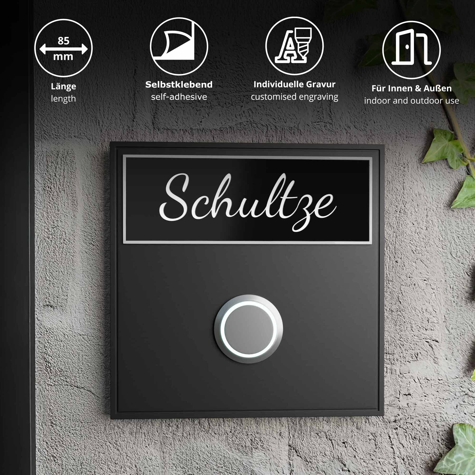 Das Klingelschild Kongsberg in edlem Tiefschwarz mit weißer Gravur steht für zeitloses Design mit starker Lesbarkeit. Mit seiner Größe von 85 × 30 mm eignet sich das moderne Türschild ideal für den Einsatz an Haustür, Klingel oder Briefkasten. Die individuelle Gravur ist in einer oder zwei Zeilen möglich. Gefertigt aus hochwertigem, wetterfestem 2-Schicht-Acryl ist das Namensschild UV-beständig und langlebig – ideal für den Einsatz im Außenbereich. Die helle Gravur hebt sich klar vom dunklen Hintergrund ab und sorgt für ein elegantes Erscheinungsbild. Die Montage gelingt mühelos dank der selbstklebenden Rückseite – ohne Bohren. Wählen Sie aus fünf Gravurschriften, optional abgerundeten Ecken und ergänzen Sie bei Bedarf ein "Keine Werbung"-Schild. Ein stilvolles, funktionales Türschild für Ihr Zuhause.