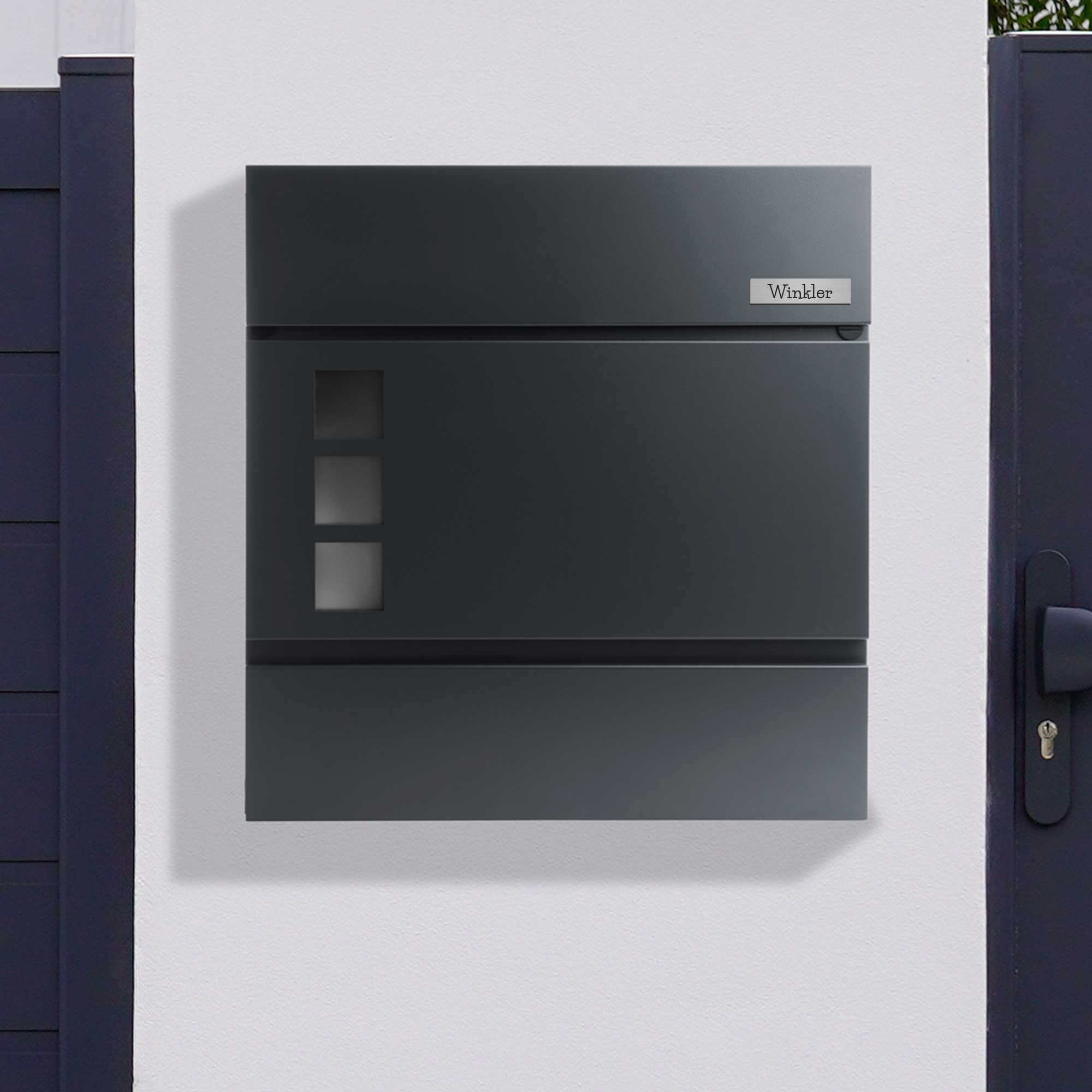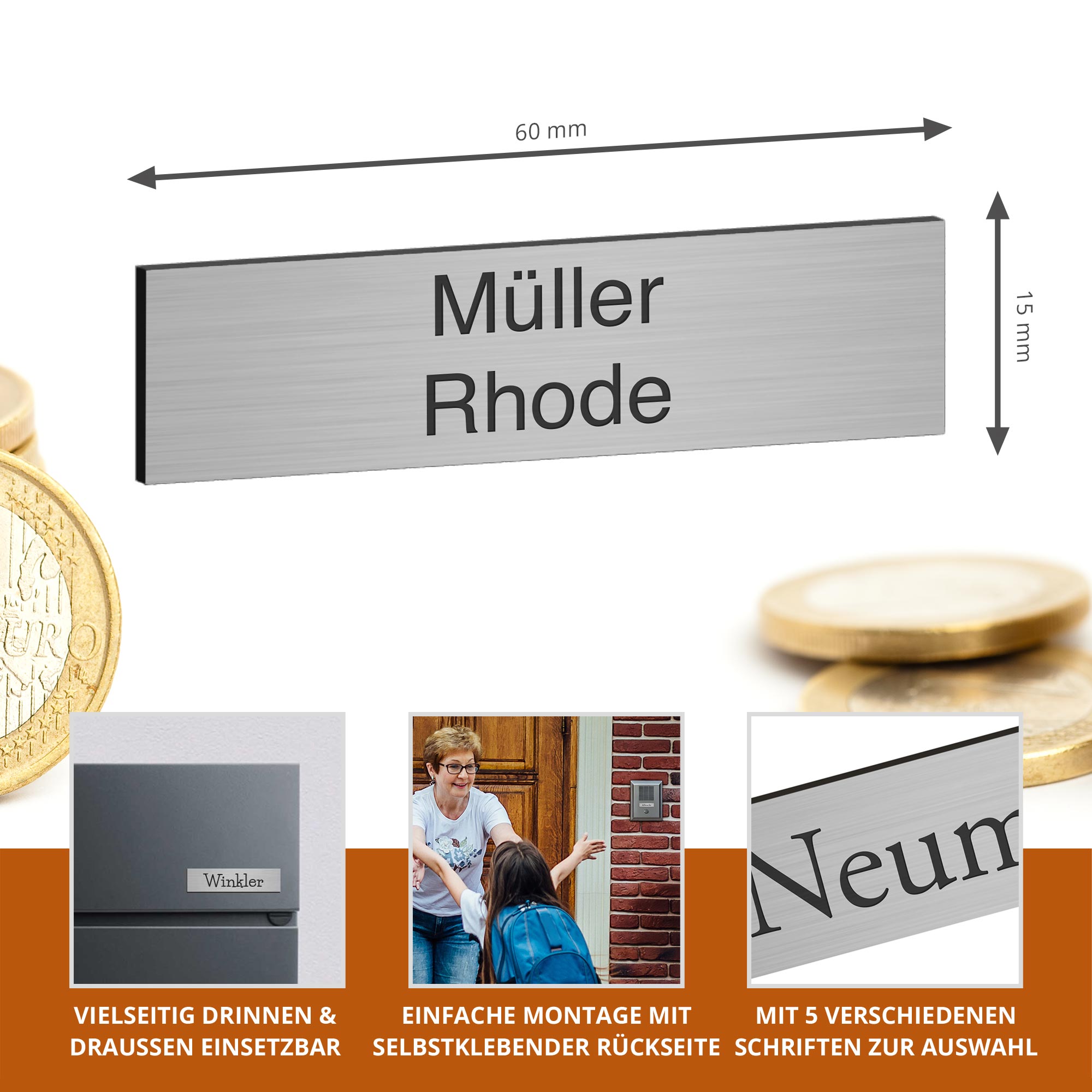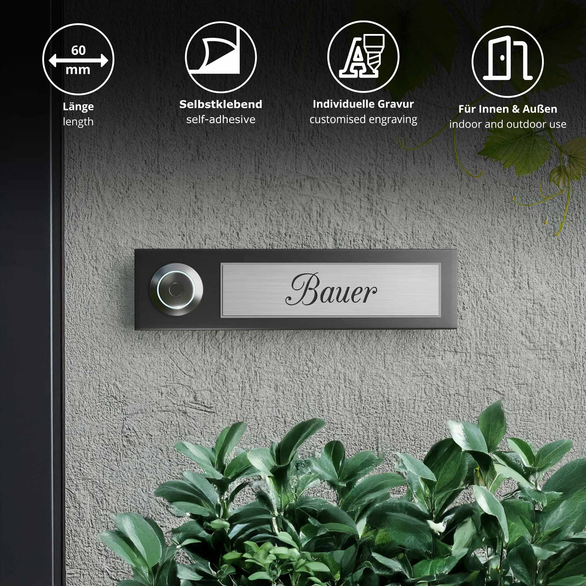 Das Klingelschild Kongsberg in edlem Silber ist ein hochwertiges, kleines Türschild (60 × 15 mm), ideal für Briefkasten oder schmale Türbereiche. Mit langlebiger, individueller Gravur - in einer oder zwei Zeilen - und selbstklebender Rückseite lässt sich das Briefkastenschild schnell und sauber montieren. Die dezente silberne Optik passt zu vielen Fassaden und Haustüren und wirkt modern und unaufdringlich. Durch wetterfestes Acryl-Material ist der Einsatz sowohl innen als auch außen problemlos möglich. Wählen Sie Ihre Wunschgravur in fünf Schriftarten für ein personalisiertes Namensschild, optional mit abgerundeten Ecken oder einem "Keine Werbung"-Schild.
